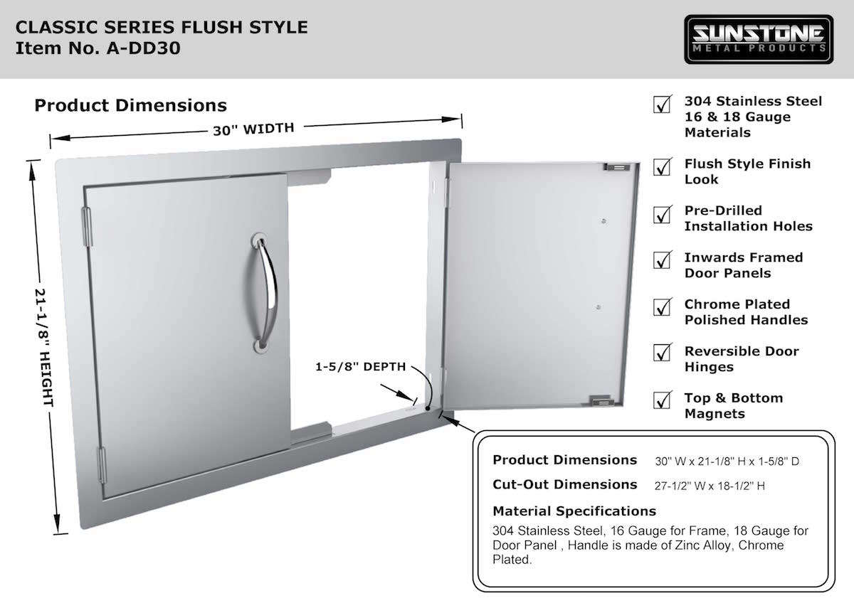 This double door is a must have in your Outdoor Kitchen. It is beautifully designed and offers the same brushed finish as your grill The door fits against exterior wall, so it’s perfect for multiple types of installation whether on Paint, Stone or Stucco, and the pre-drilled frame holes allows an easy installation.