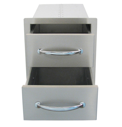 Sunstone® Double Drawer is sized to fit perfectly under your Side Burner. This deep drawer will give symmetry and add storage space to your Outdoor Kitchen. You can also make combinations of drawers side by side below your counter or match it with a Simple or Triple Drawer. With matching brushed stainless steel and Polished Chrome Handles, this beautiful drawer creates a perfect complement to your Sunstone® Side Burner and all your BBQ Tools, Sauces and Spices will be safe - Solid 16 and 20 Gauge 304 Stainless Steel |