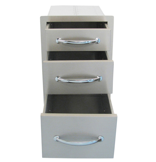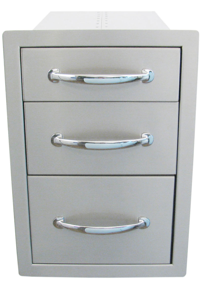 Sunstone® Triple drawer is sized to fit perfectly under your Side Burner. This deep drawer will give symmetry and add storage space to your Outdoor Kitchen. You can also make combinations of drawers side by side below your counter or match it with Double or Simple Drawers. With a bottom drawer that is higher than others, all your BBQ Tools, Sauces and Spices will be safe The matching brushed stainless steel and Polished Chrome Handles of this beautiful drawer creates a perfect complement to your Sunstone® Side Burner. - Solid 16 and 20 Gauge 304 Stainless Steel |