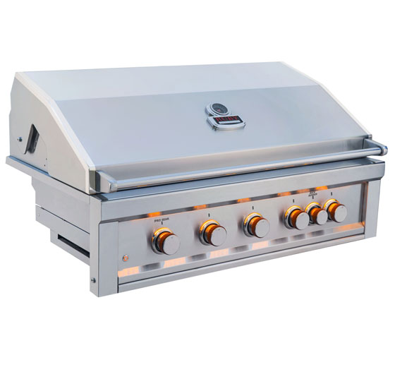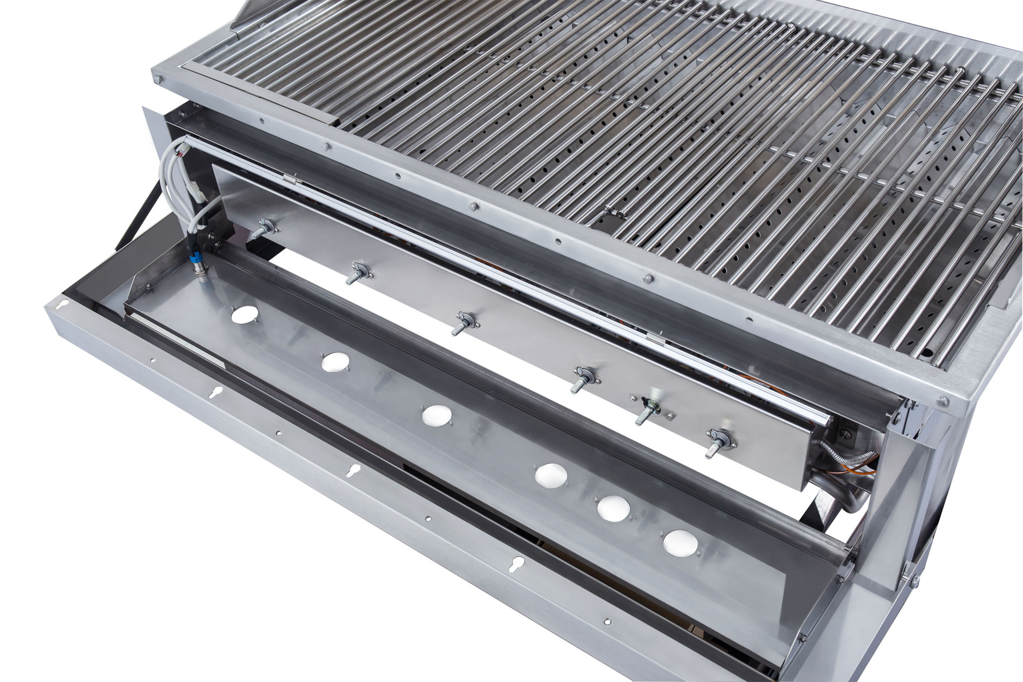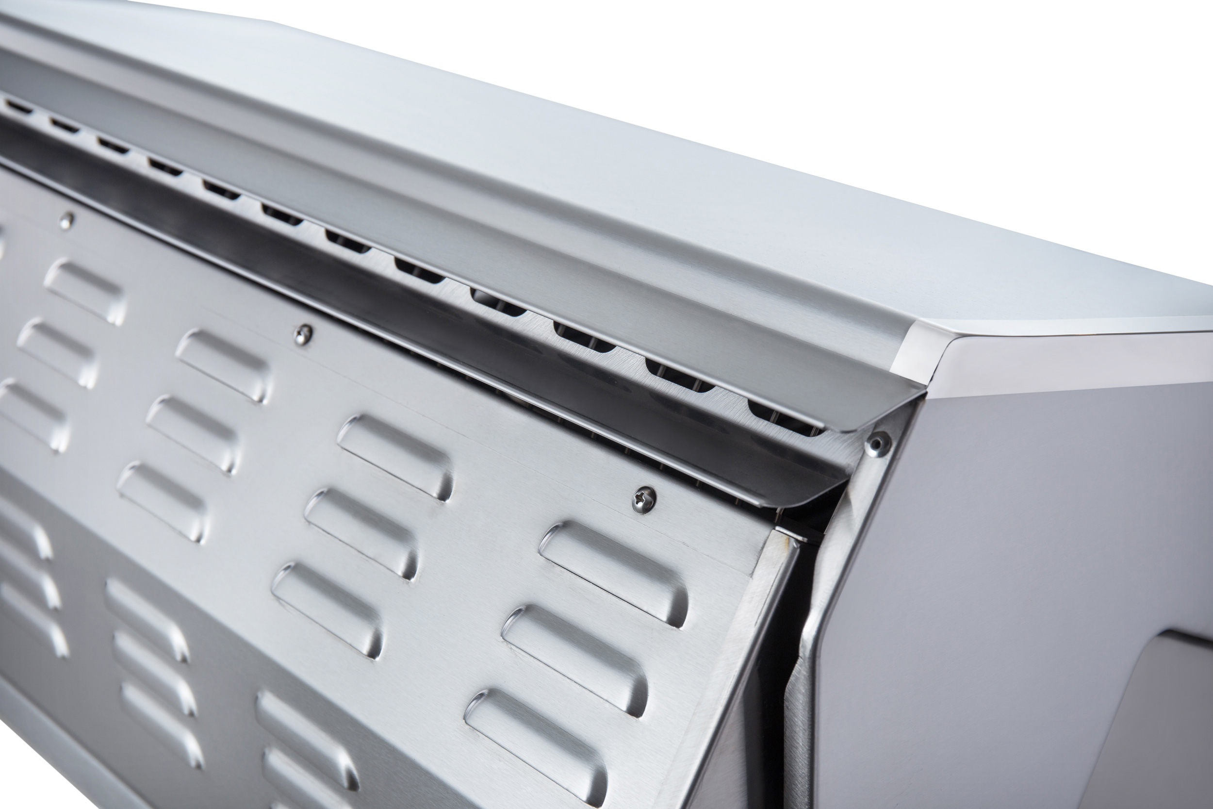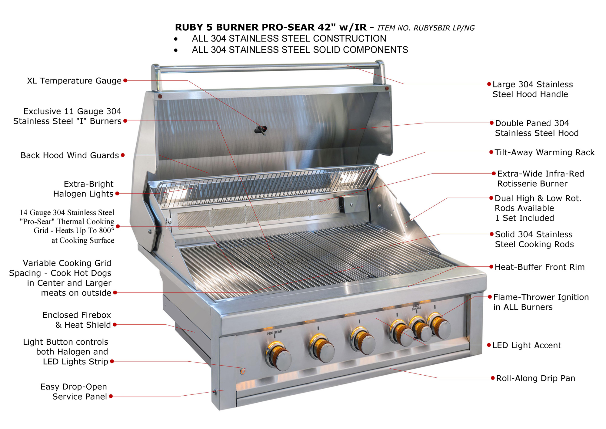 The Sunstone® 5 Burner RUBY series Gas Grill is a powerful grilling unit as well as a unique design piece. Built completely with professional grade 304 Stainless Steel, also for the I-Burners with a minimal BTU output of 75,000, and an additional 15,000 BTU Extra-Wide Rotisserie Back Burner and integrated Flame-Thrower Ignition in ALL burner positions. This grill is seriously powerful and full packed with eye catching features: